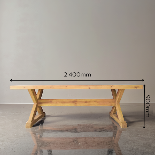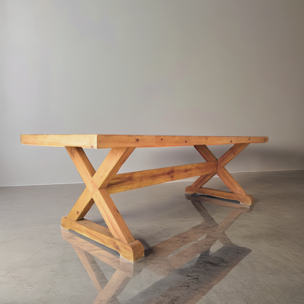 The X-shaped legs are the standout feature—wide and angled to form a bold, geometric base. These legs are not just decorative; they provide excellent structural stability. Made from matching solid oak, they are joined at the center and anchored securely to the tabletop for maximum support.
